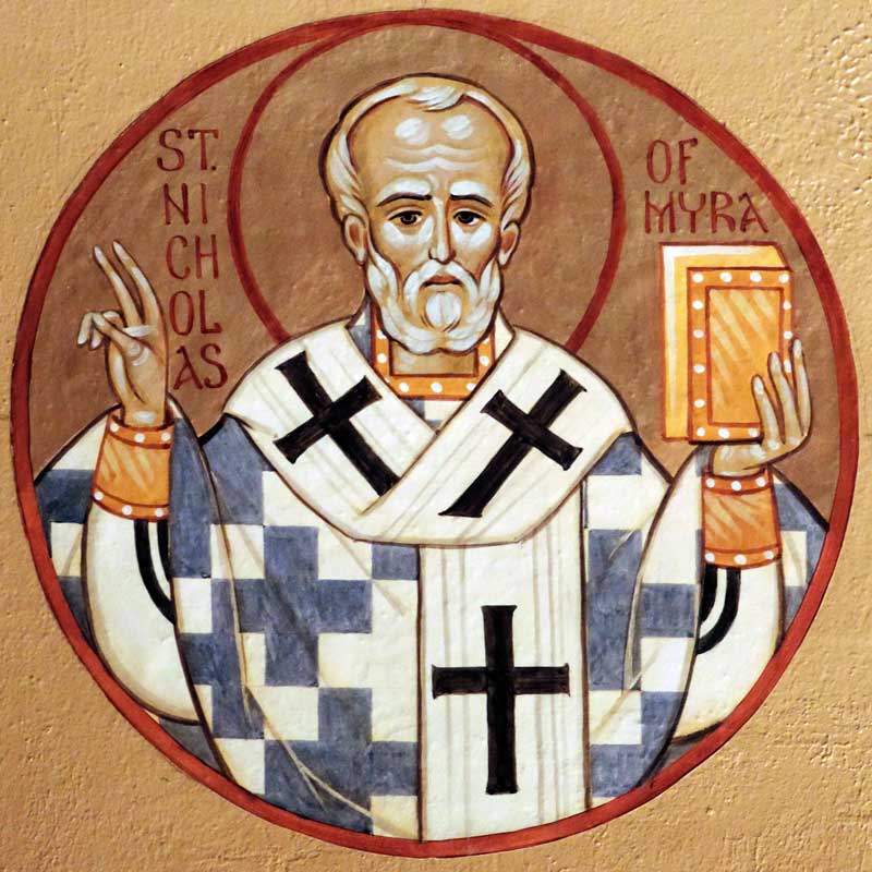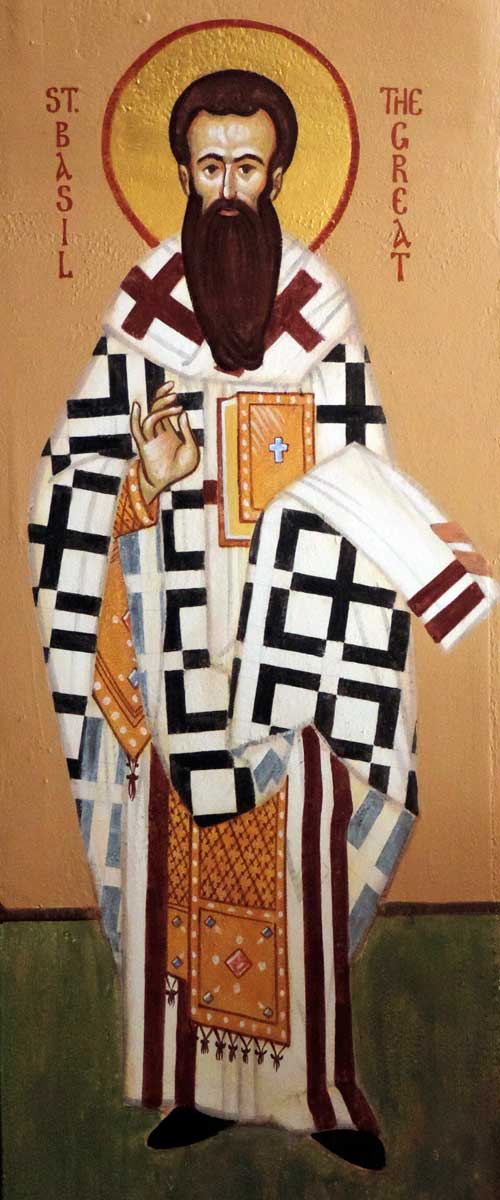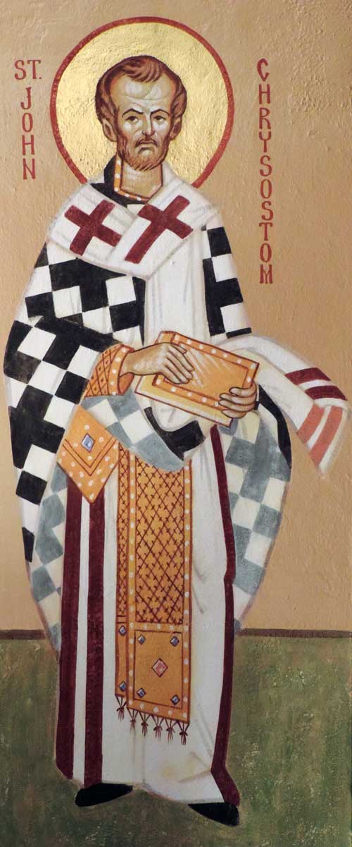 The hierarchs in medallions were painted on canvas and then adhered to the wall. The four full-figure hierarchs were painted directly onto the wall. The hierarchs are arranged on the arch that divides the nave from the altar. Two of the full-figure hierarchs are at the base of the arch (one on each side) and two are next two them, directly inside the arch (not visible in the picture below). The center medallion on the arch is a cross, not pictured in the above gallery.