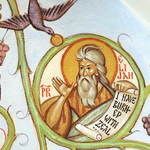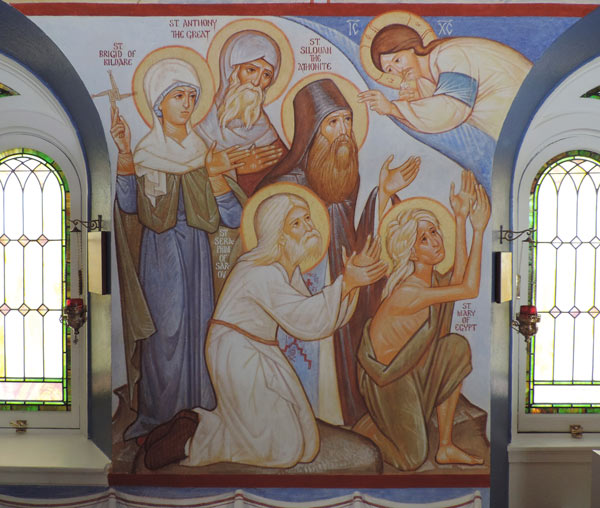 There are two saints visible only from inside the sanctuary: St. Theophil, the fool for Christ of the Kiev Caves and St. Ilarion the Georgian of Mount Athos.